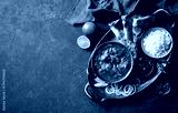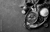 Authentic Indian feast: chicken tikka masala with rice, naan, lime and spices. Grey background. Copy space. Top view.