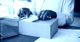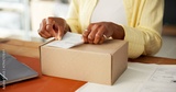 Box, label and logistics with hands of woman in office for shipping details, priority mail or info. Package sticker, business order or person with distribution for supply chain, delivery or ecommerce