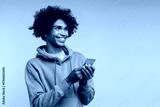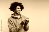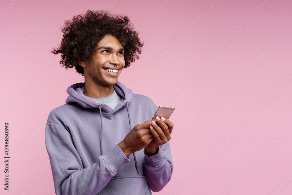 Smiling happy African American man holding mobile phone using mobile app text message looking away