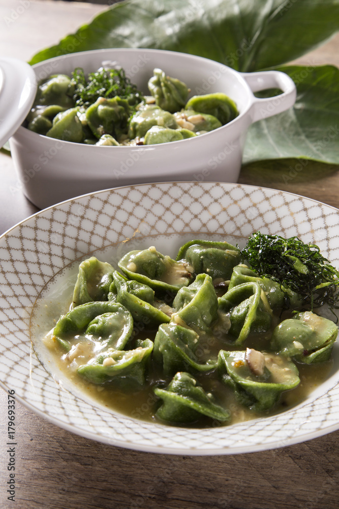 Taioba capletti filled with shitake, chestnut and garlic - Italian cuisine