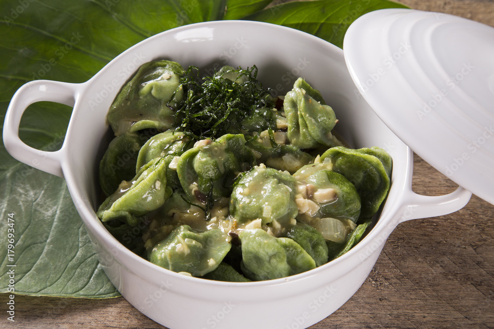 Taioba capletti filled with shitake, chestnut and garlic - Italian cuisine