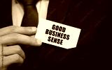 Businessman putting a card with text GOOD BUSINESS SENSE in the pocket