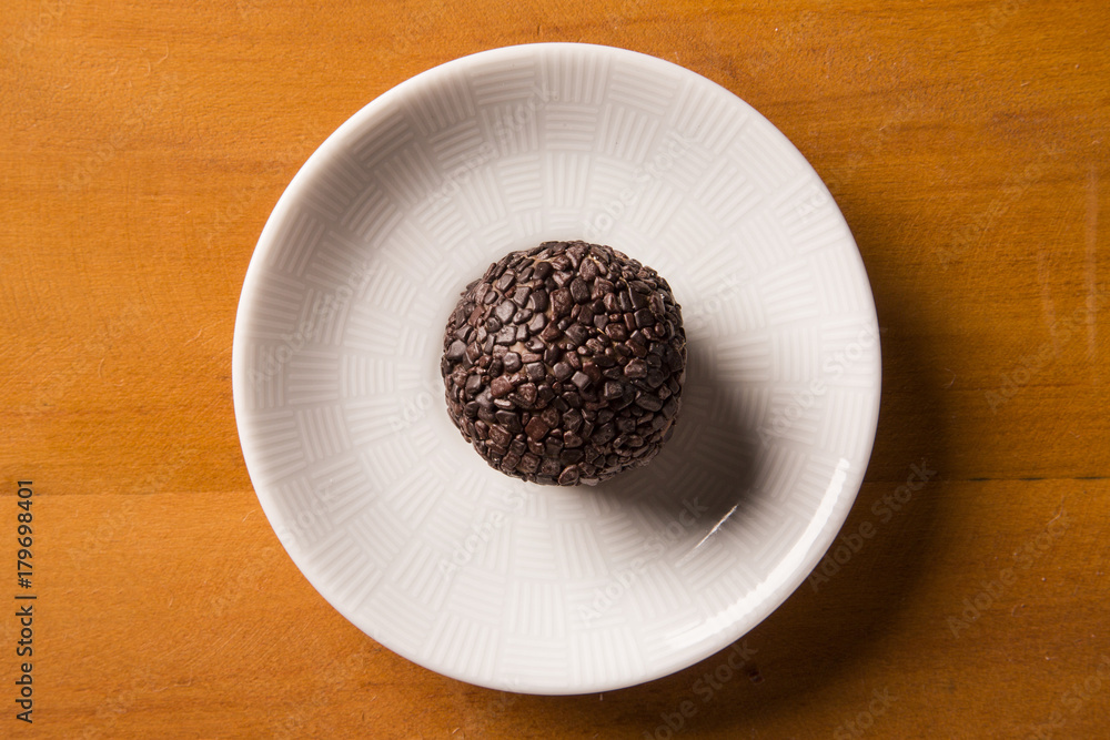 Traditional brazilian sweets - brigadeiros - over wood background.