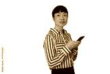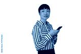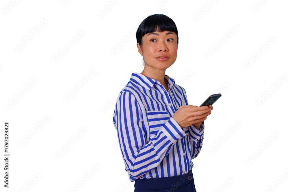 Happy woman holding shopping bags and talking on cellphone, enjoying retail therapy with transparent background