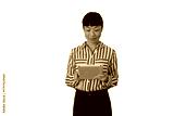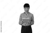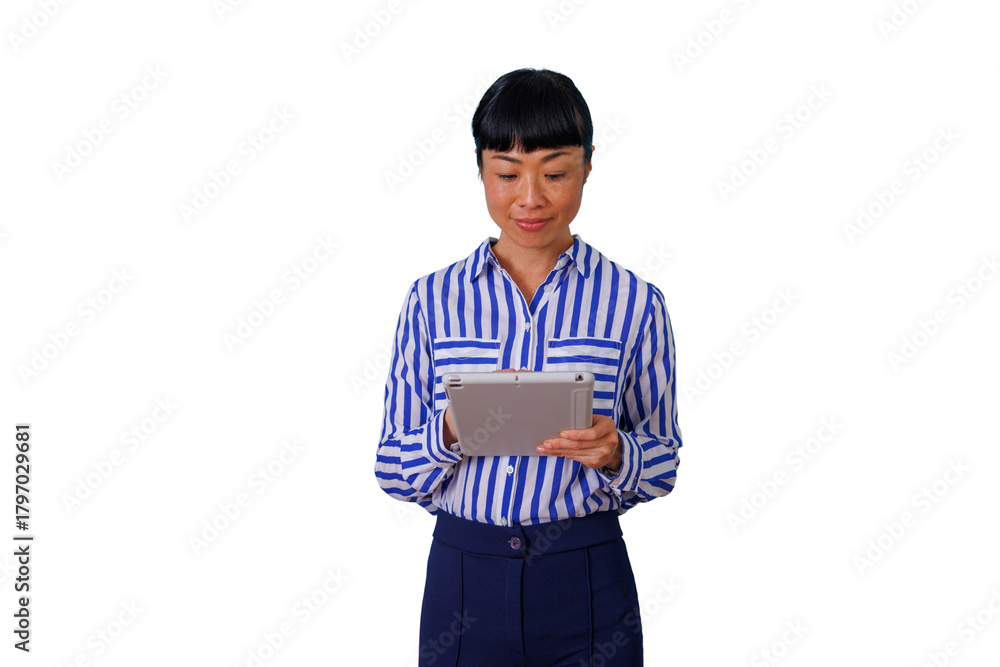 Woman doctor in lab coat with a stethoscope around her neck, smiling and engaging with her phone on a transparent background