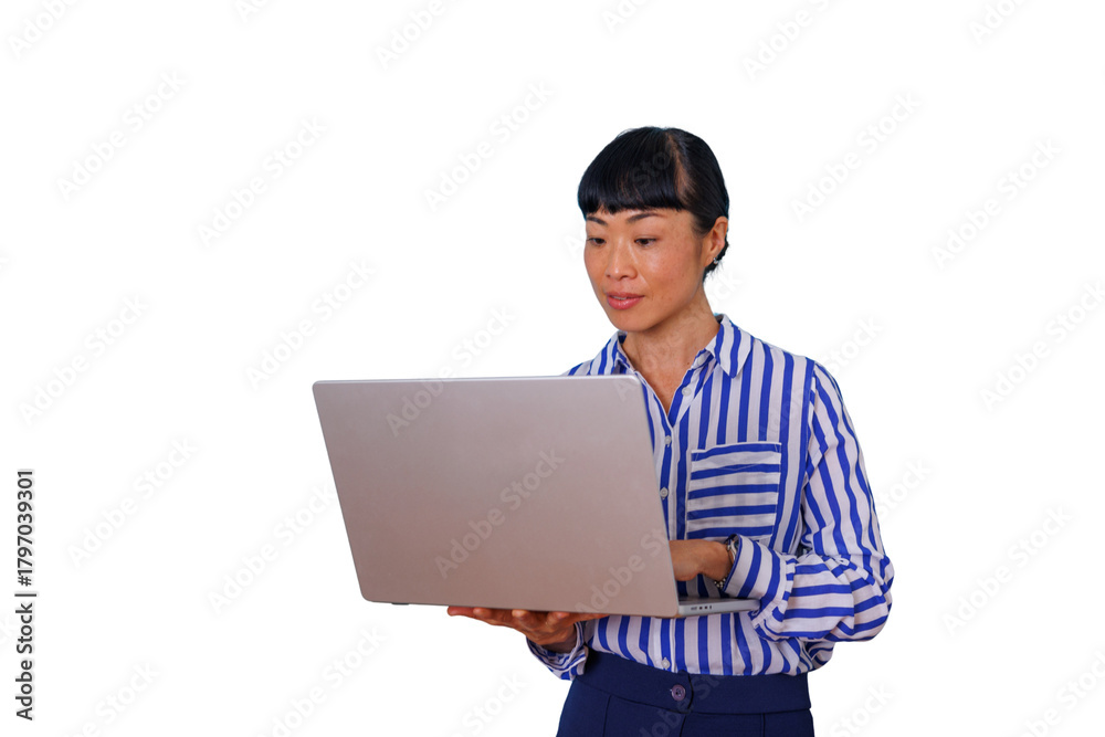 Female doctor using laptop in healthcare setting, providing medical consultation, smiling, on transparent background