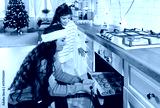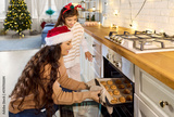 Christmas family baking cookies together in kitchen. Mother lifts a tray from the oven while daughter, a child girl, watches cozy holiday aroma fills home. Winter holiday baking together.