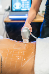 Professional performing non surgical High Intensity Focused Ultrasound treatment on a patient's marked abdomen, stimulating collagen for skin lifting and contouring
