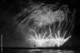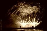 Beautiful, festive, colorful fireworks over the sea with reflection