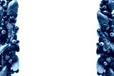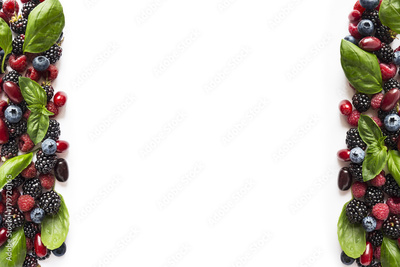 Black-blue and red berries isolated on white. Ripe blackberries, blueberries, raspberries, cornels and basil leaves on white background.