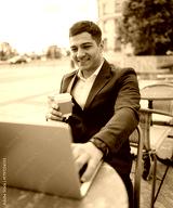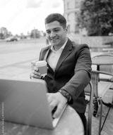 Man smiles with laptop and coffee