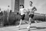 Couple jogging on a path near modern buildings