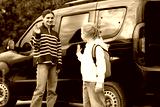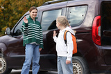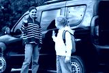 Mother taking her daughter to school near car outdoors