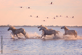 Beautiful white horses running on the water against the background of flying flamingos at soft sunset light, Parc Regional de Camargue, Bouches-du-rhone, Provence - Alpes - Cote d'Azur, south France