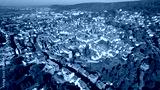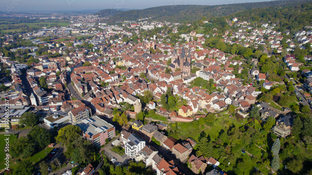 Aerial panorama view of the old town of the city Gelnhausen, 63571 in Germany on a sunny morning in autumn, fall.