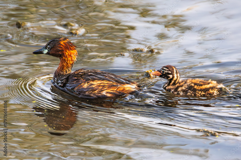 Close-up of a little grebe (Tachybaptus ruficollis) with its chick behind in a wetland in southern Granada, Spain