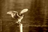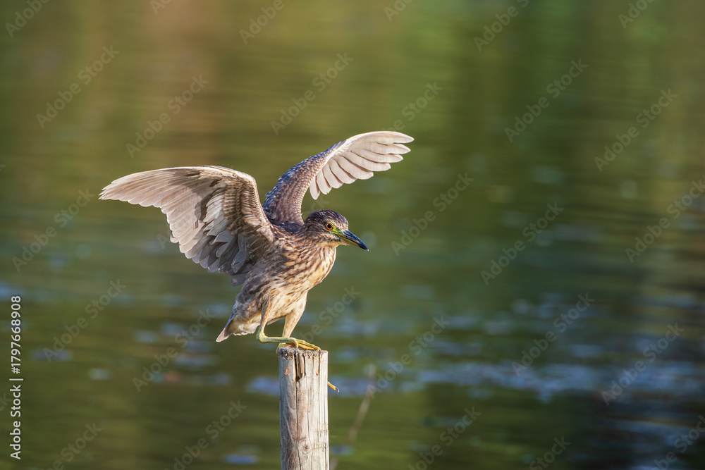 Juvenile black-crowned night heron (Nycticorax nycticorax) with wings spread on a log in a wetland