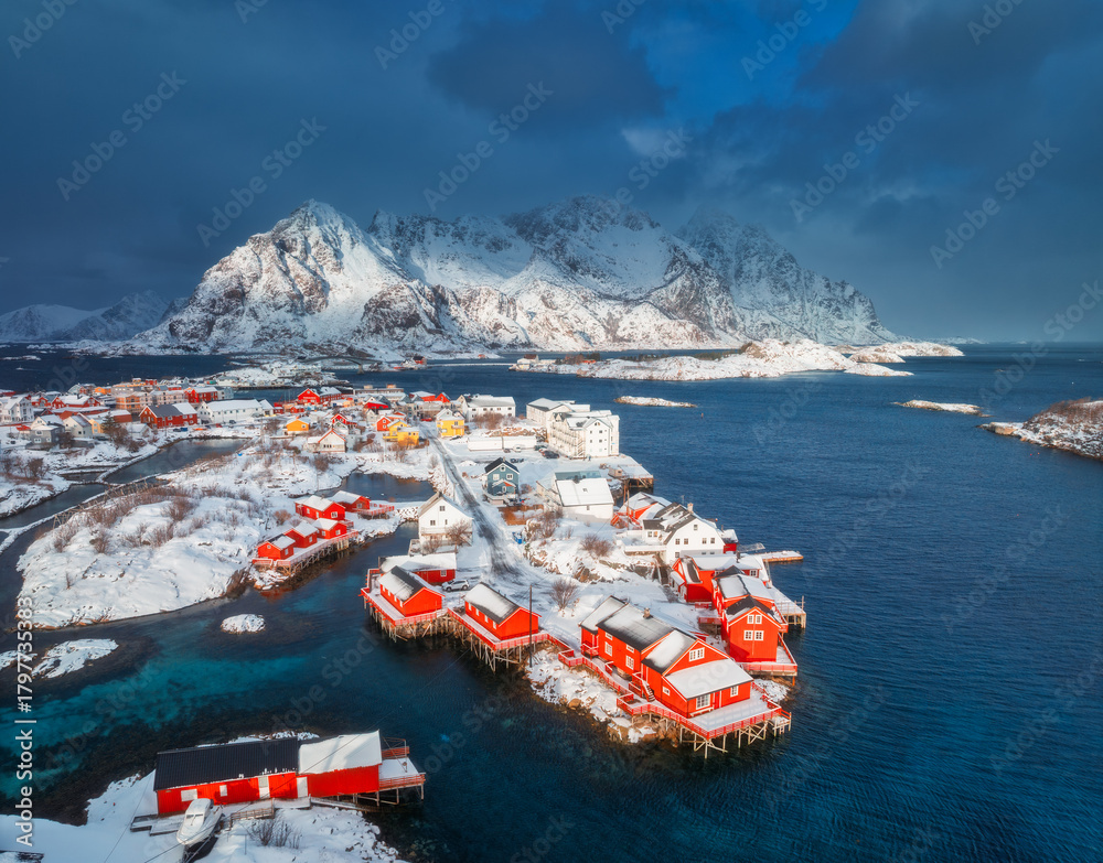 Aerial view of snowy Henningsvaer fishing village, Lofoten islands, Norway in winter at sunset. Top drone view of mountains in snow, sea, boats, bridge, road, cloudy sky, town, rorbuer and houses