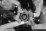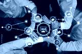 A diverse group of professionals engages in teamwork, with hands joined symbolizing collaboration. The graphic elements enhance the focus on data analytics and strategic insights. Amity