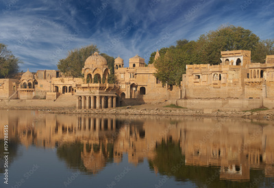 Gadi Sagar temple on Gadisar lake Jaisalmer, India.