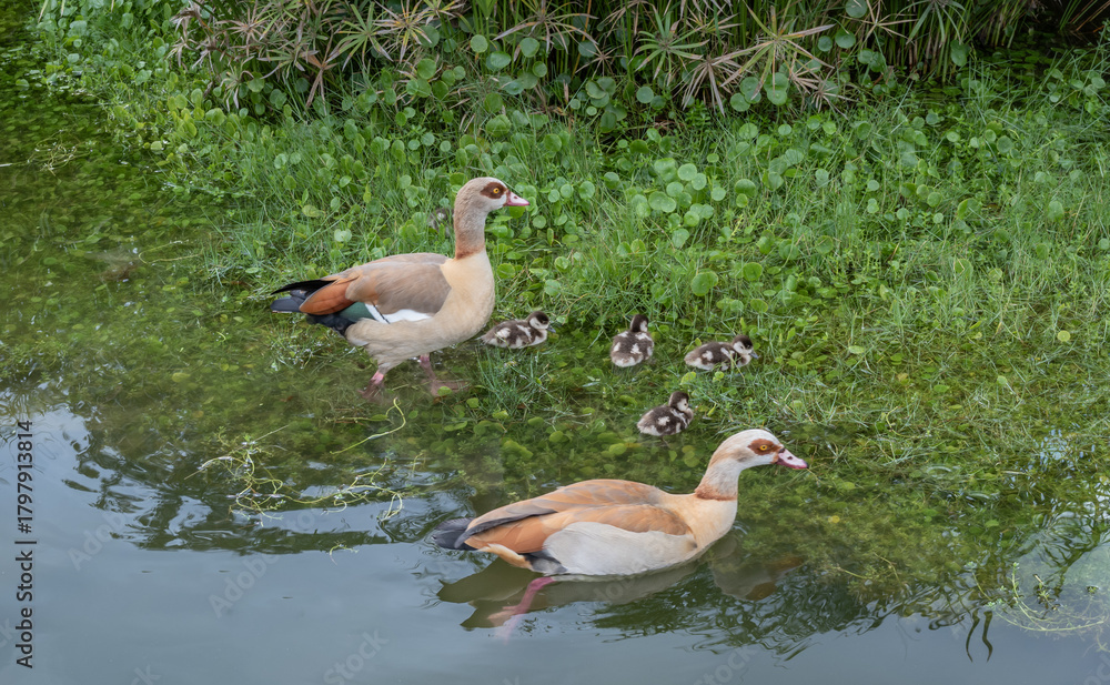 Egypt Nile goose couple with goslings at pond in Petah Tikva, Israel