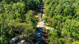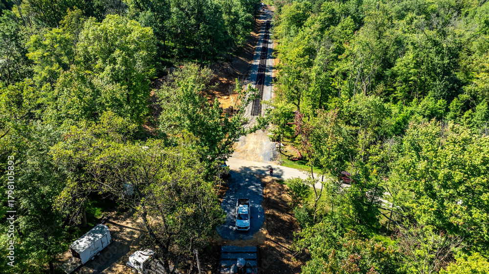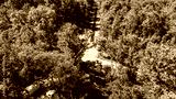 An aerial perspective reveals a tree-covered landscape with a winding path leading through the woods. Several structures are visible along the route, bathed in warm sunlight.