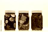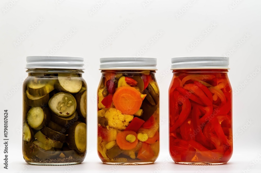 Three canning jars filled with various pickled vegetables sit against a white backdrop. The jars contain slices of cucumber, carrots, cauliflower, and bell peppers, showcasing vibrant colors and