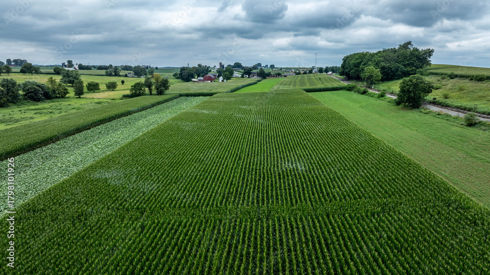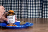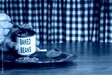 A hand holds a spoon as it scoops baked beans from an opened can onto a blue plate. The setting features a checkered curtain and a wooden table, creating a cozy, homey atmosphere.
