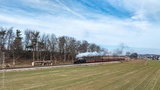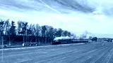 A vintage steam train puffs clouds of smoke as it moves through lush green fields. The scene is peaceful, with trees lining the railway and a calm blue sky overhead.
