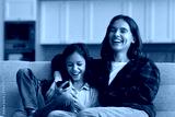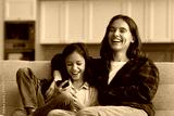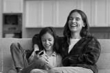 Overjoyed millennial mom embrace laughing tween daughter using mobile phone