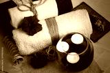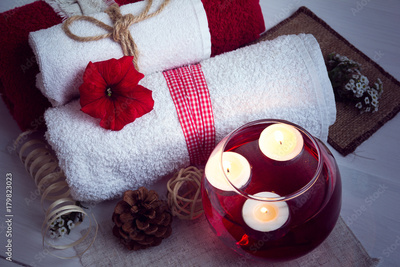 SPA consist from towels, candles, flowers, and aromatherapy water