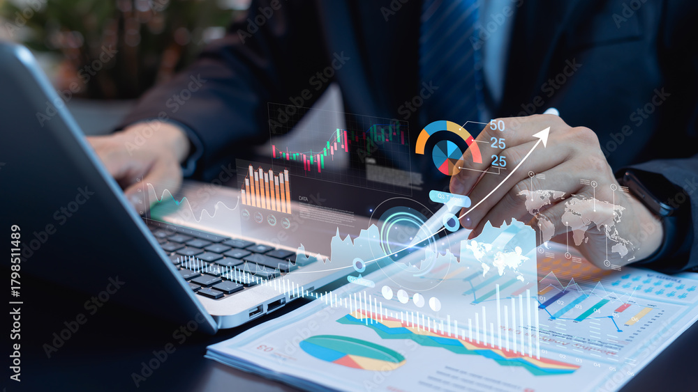 Investment and finance growth concept. Businessman analyzing money, profit, income, and financial data for economic success, business development, and long-term investment strategy.