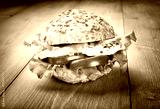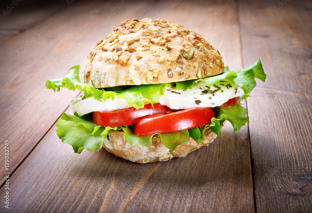 Caprese sandwich, tomato, mozzarella, lettuce and origan on wooden background
