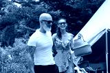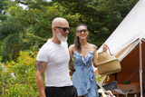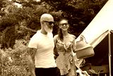 A man and a woman are standing closely in front of a large tent