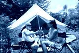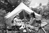 A man and woman is joyfully toasting with beer near a cozy tent at a glamping site.