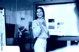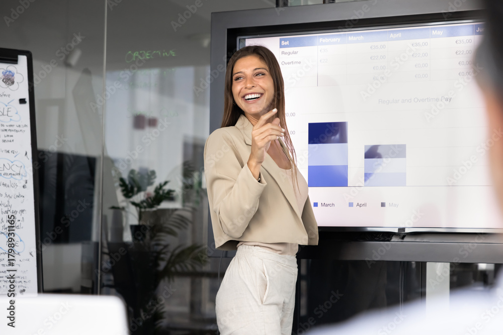 Happy young female business product manager presenting analytic data
