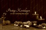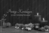 Weihnachtskarte: Rustikale Weihnachtsdekoration mit Kerzen, Zweigen und Weihnachtskugeln auf einer Holzwand steht der Niederländische Text Prettige Kerstdagen en een Gelukkig Nieuwjaar.