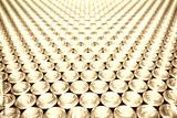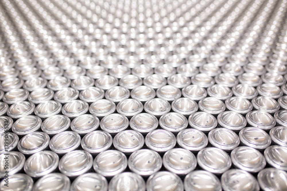 Close-up of aluminum cans on a conveyor belt. Plant for the production of energy drinks. Conveyor line for the production of beverages. Industrial production of food products.