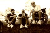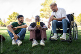 African American man in a wheelchair and friends sitting on the grass looking at mobile phone in a park.