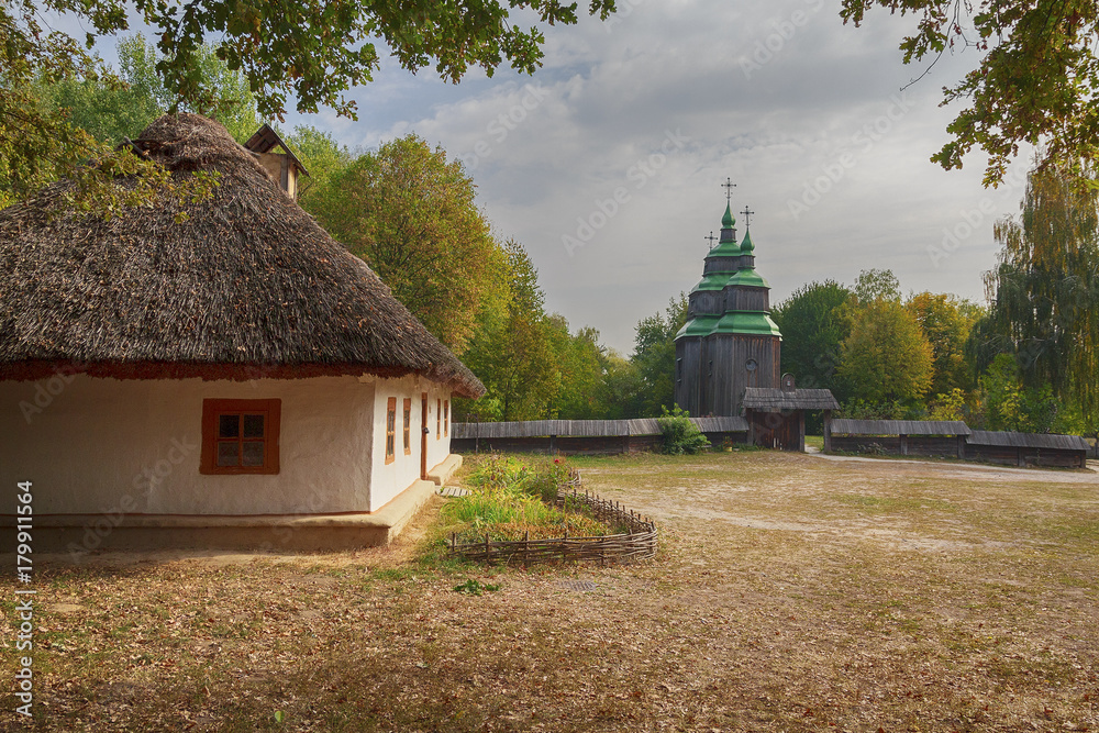 Old house of the peasants and church at the Museum of Pirogovo. Ukraine