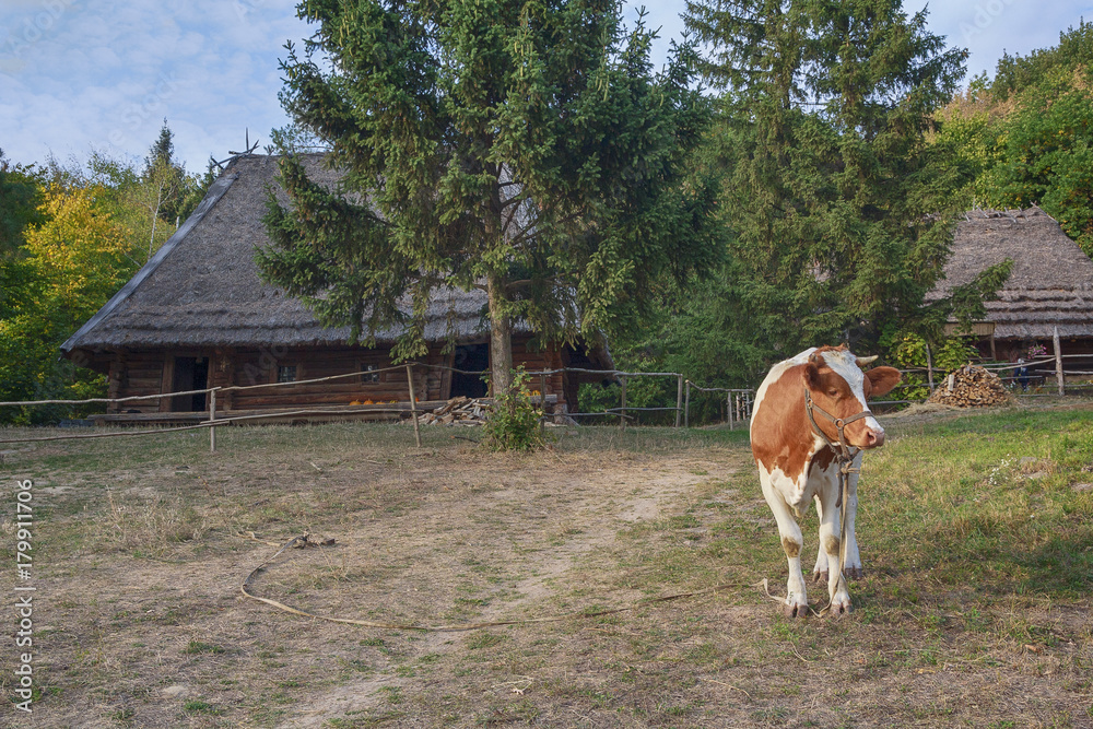 ?ow grazing on a meadow near a retro farmhouse. Ukraine