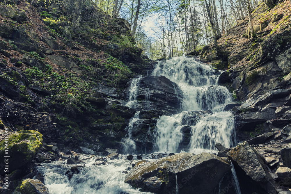 Forest landscape with a beautiful waterfall. Carpathians, Ukraine