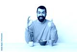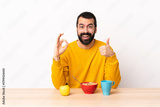 Caucasian man having breakfast in a table showing ok sign and thumb up gesture.
