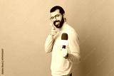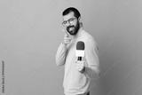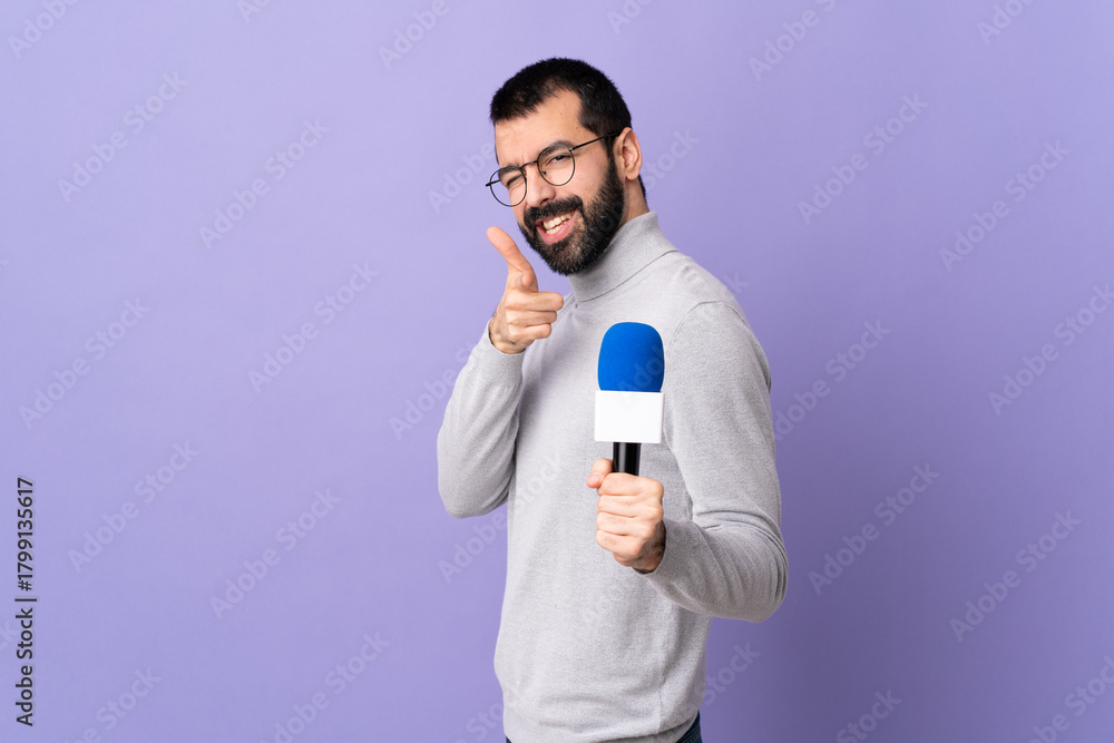 Adult reporter man with beard holding a microphone over isolated purple background pointing to the front and smiling