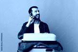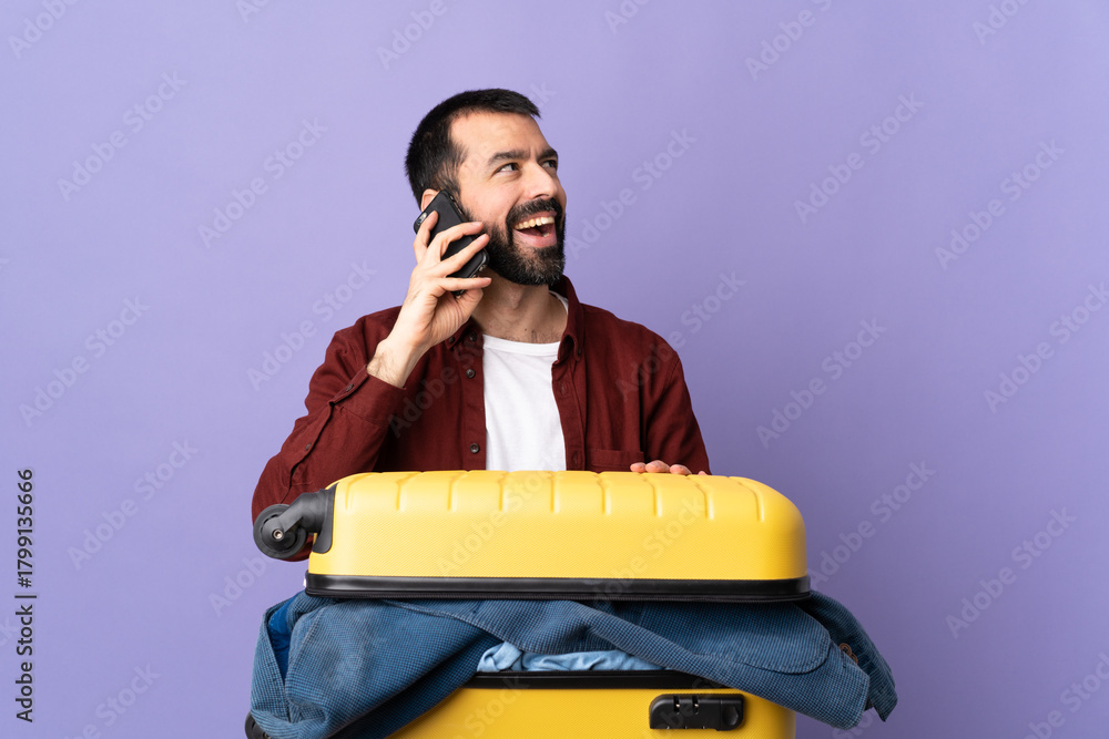 Traveler caucasian man with a suitcase full of clothes over isolated purple background keeping a conversation with the mobile phone
