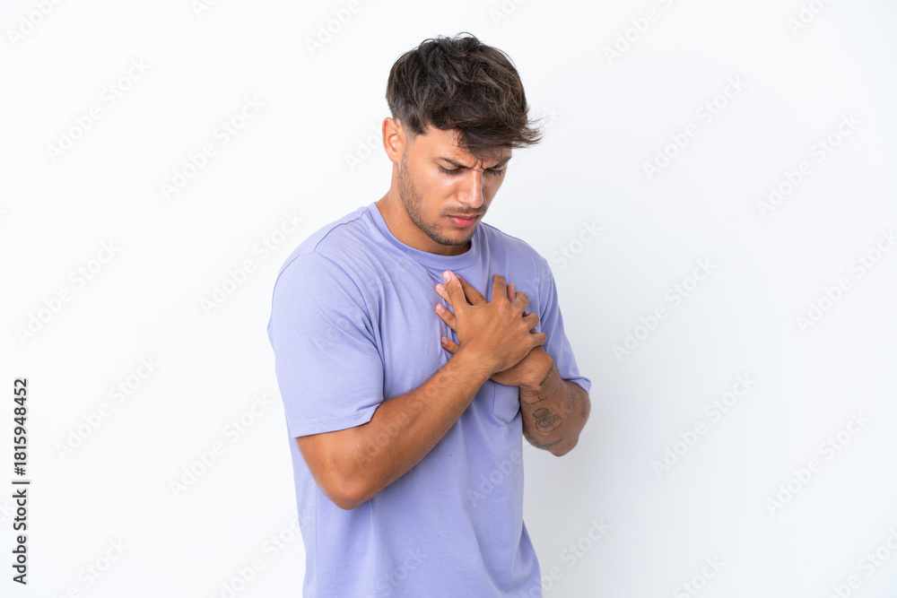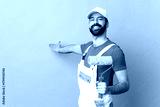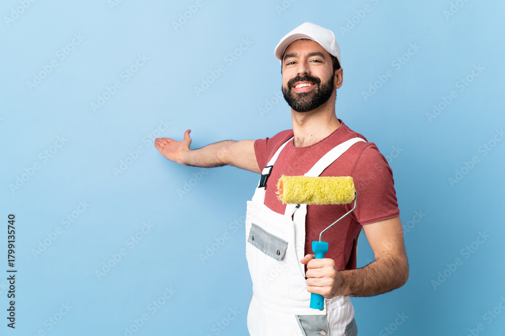 Adult painter man over isolated blue background extending hands to the side for inviting to come
