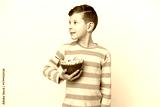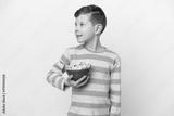 Little caucasian boy holding a cereal bowl isolated on white background looking to the side and smiling