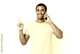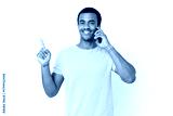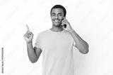 African American handsome man using mobile phone over isolated white background showing and lifting a finger in sign of the best