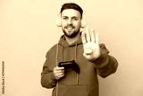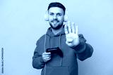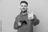 Young caucasian man playing with a video game controller isolated on yellow background happy and counting four with fingers