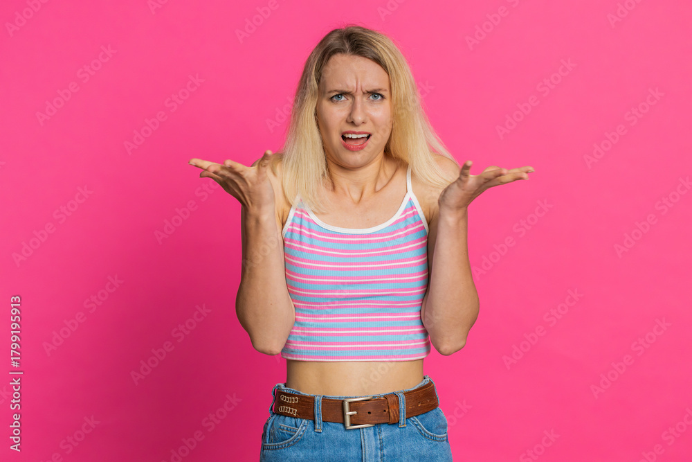 What. Why. Angry confused young woman in crop top raising hands in indignant expression, asking reason of failure, demonstrating disbelief irritation by troubles. Girl isolated on pink background